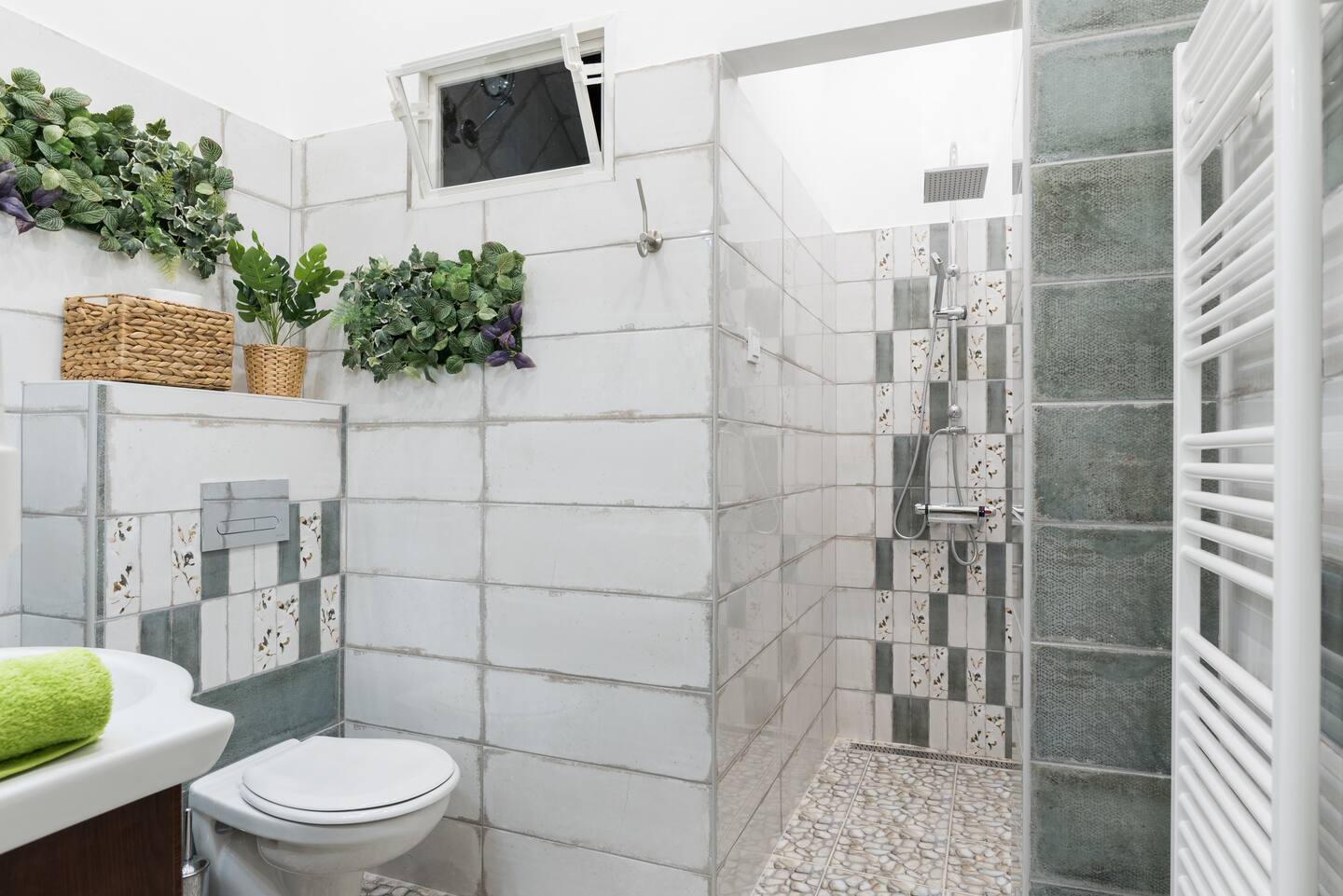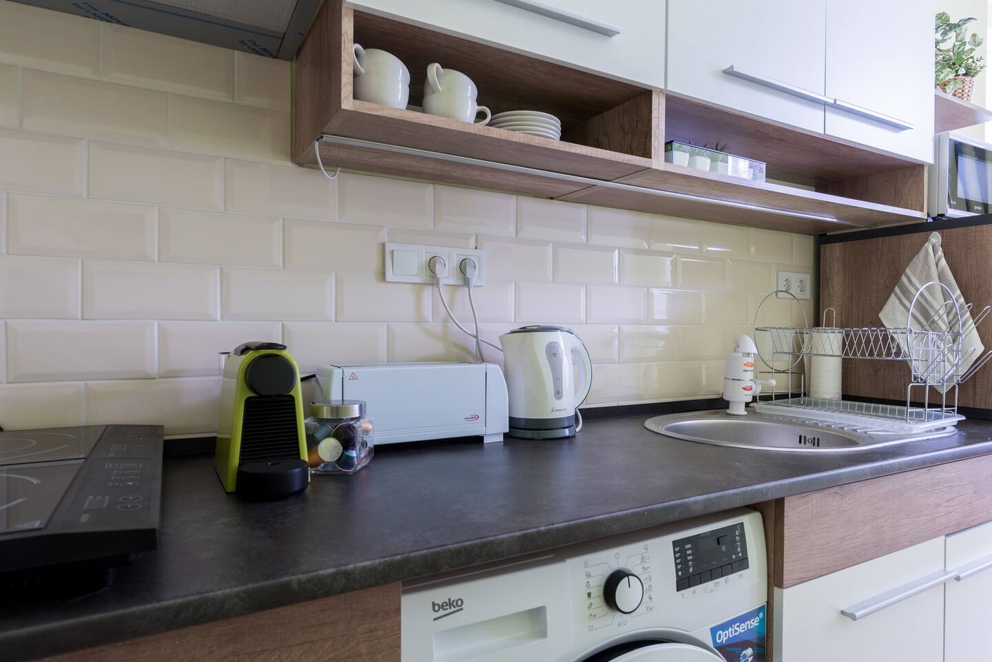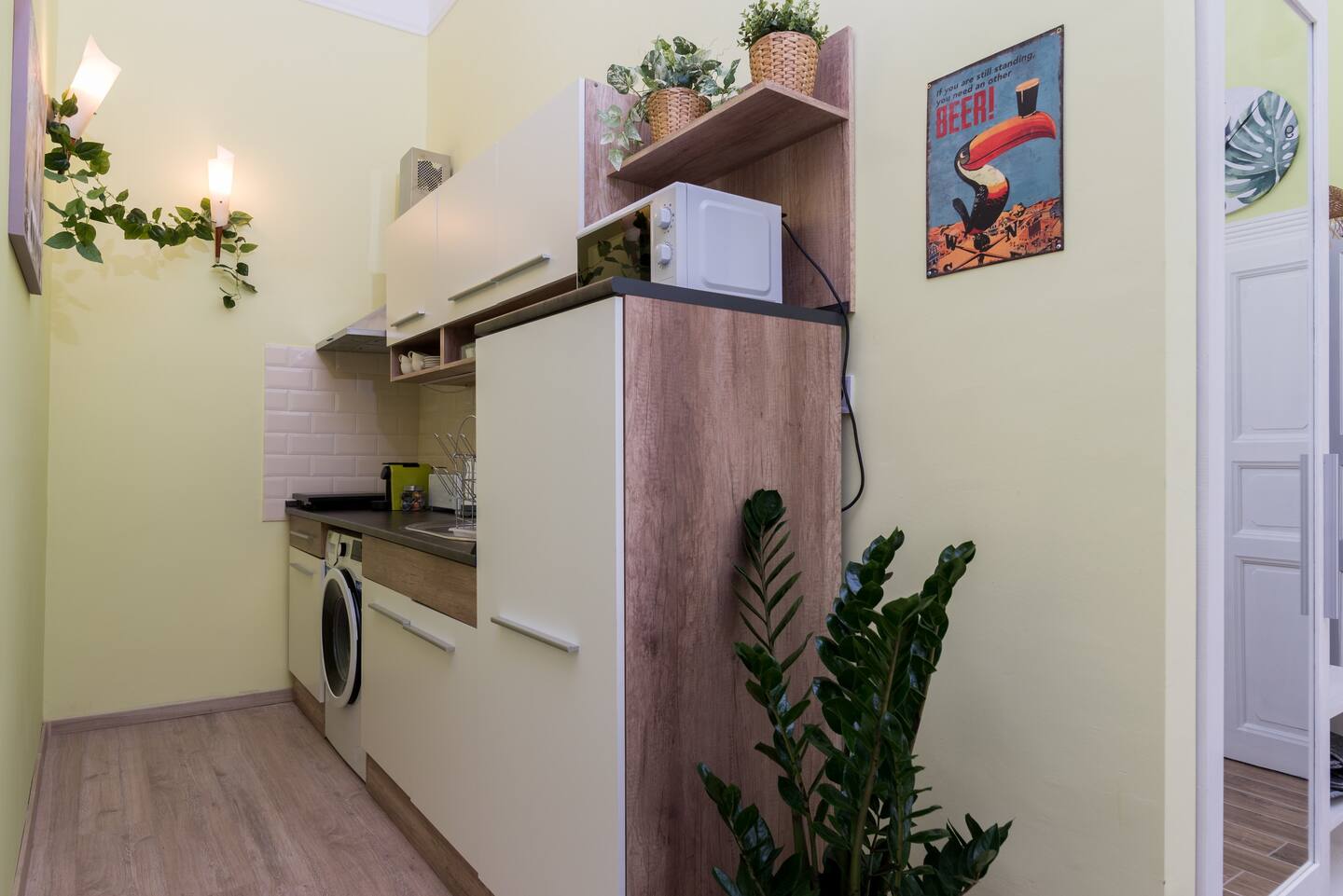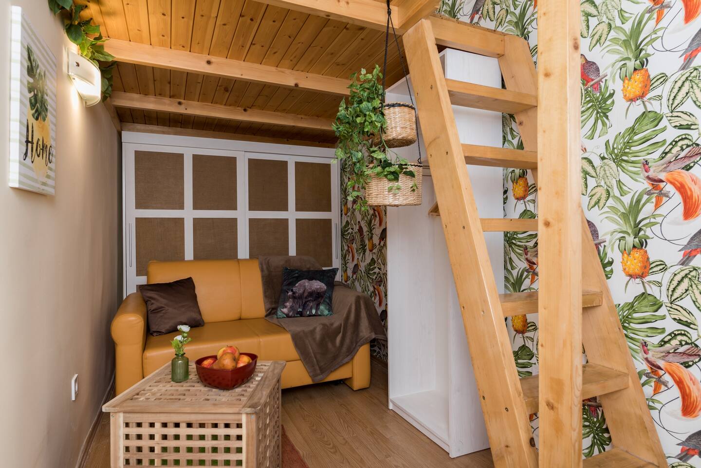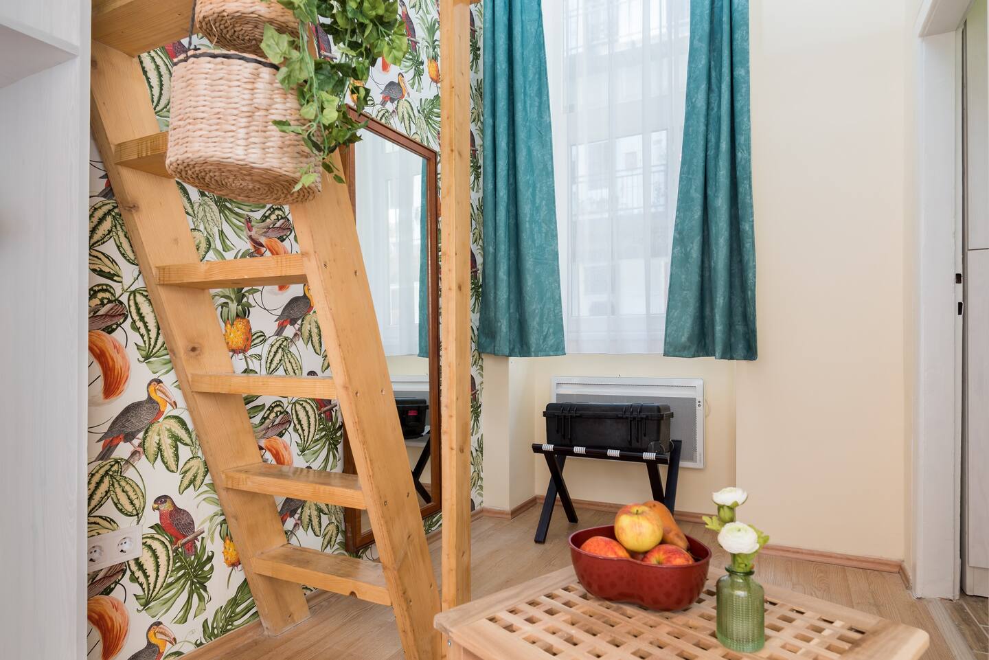 The Jungle Design Apartment is a uniquely designed little jewel box. It has recently undergone complete reconstruction and renovation. The cheerful, cosy two-bedroom apartment is on the 1st floor of a renovated Art Nouveau building very close to the Keleti railway station in the eastern area of the City Centre. We took great care of furnishing the apartment, taking advantage of its properties. The heating system is equipped with electrical panels, infrared panels, and hot water is supplied with electric boiler. There is no gas in the apartment. The kitchen is fully equipped. For your satisfaction we provide fast internet, free wifi and flat-screen TV featuring many sports and music channels. Two comfortable boxspring double beds provide a peaceful night’s rest. There is also a single-person sofa bed under the gallery. You can make your morning coffee with the excellent Nespresso capsule coffee machine. The bathroom has pleasantly warm underfloor heating. The air conditioning helps to keep off the summer heat. The apartment is sunny, bright and quiet. There is CCTV in the stairwell of the house. The building is unfortunately not accessible by wheelchair.
